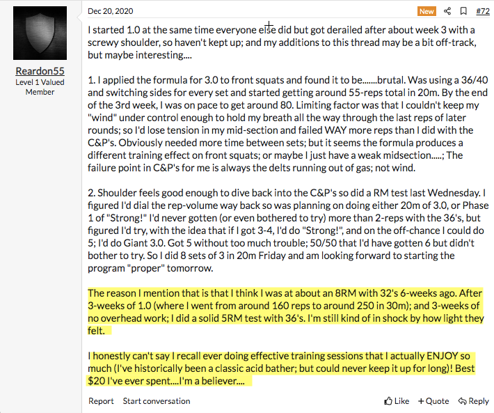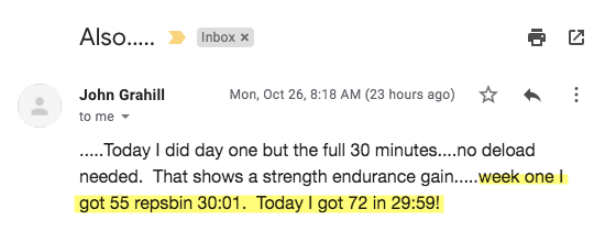 John emailed me after Day1, Week 4. He was able to improve his reps from 55 in one session to 72 in one session... in only 4 weeks.